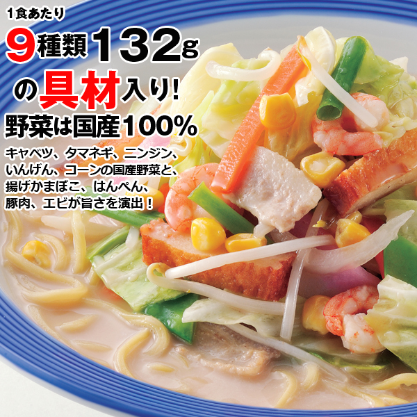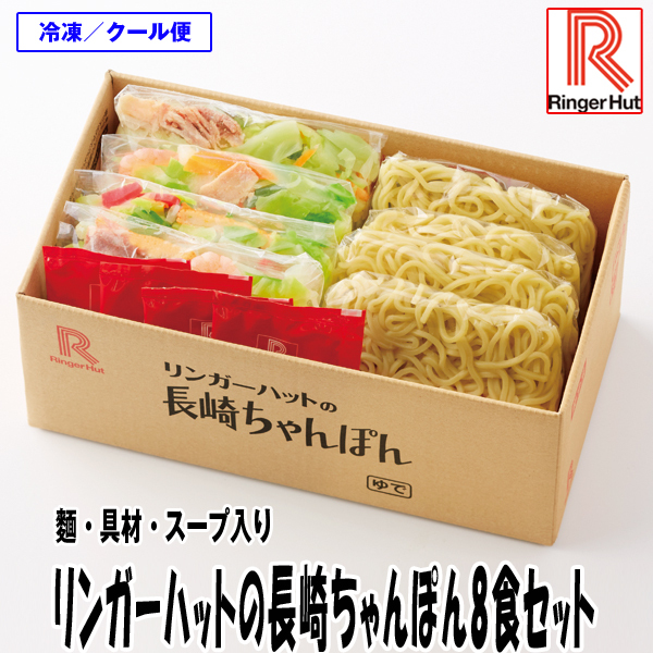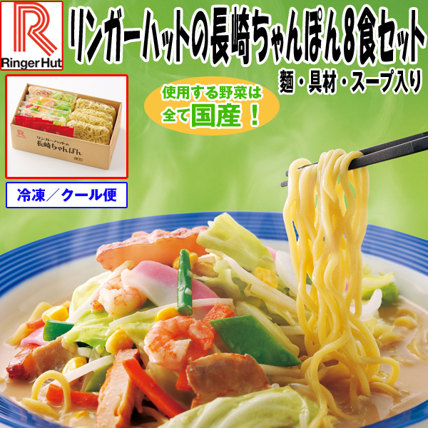 名店「リーンガーハット」の長崎ちゃんぽんが店に行かずとも自宅で食べられる、夢のようなお取り寄せ!!冷凍庫にストックできるからいつでも出来たて食べられます!リンガーハットといえば「長崎ちゃんぽん」 人気メニュー、長崎ちゃんぽんをコンパクトにパックし、ご家庭で手軽に楽しめるよう特別8食セットでお届けいたします。使用する野菜は全て国産100%。新鮮でおいしい野菜を使用しています。リンガーハット自信の一品をこの機会にぜひご賞味ください!<美味しさにヒミツが!>国産小麦を使用した冷凍ちゃんぽん麺、スープ、国産野菜を使用した9種類132gの具材が、たっぷりとセットになっているから!柔らか甘みたっぷりのキャベツ、たまねぎ、ニンジン、ネギ、枝豆、コーン、揚げかまぼこ、豚肉、エビが美味しさを演出します♪麺は自家製麺150gの中太のストレート麺。具材とスープが一体となってつるつるののどごしが自慢です。