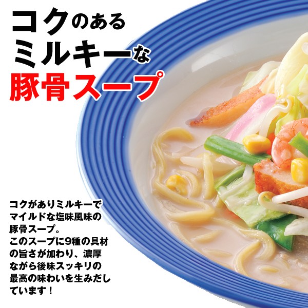 ■原材料名(一括表示):めん [小麦粉、粉末状植物性たん白/加工でん粉、かんすい、クチナシ色素] 、具 [野菜(キャベツ、玉ねぎ、にんじん、ねぎ、コーン)、揚げかまぼこ、味付豚肉(豚肉、香辛料、食塩、植物油脂、ポークエキス、ポークオイル)、はんぺん、えび/増粘剤(加工でん粉)、調味料(アミノ酸)、ベニコウジ色素、焼成カルシウム] 、スープ [食塩、ガラスープ、香味油、ポークオイル、シーズニングペースト、マルトデキストリン、アサリエキス、しょうゆ、菜種油、ラー油、酵母エキス、たん白加水分解物、乳たん白、デキストリン、香辛料/調味料(アミノ酸等)、カラメル色素、香辛料抽出物、酸化防止剤(V.E)]、(一部に小麦・乳成分・えび・いか・大豆・鶏肉・豚肉・ごまを含む)