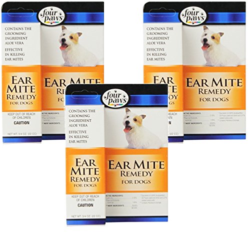 -. Binding : Misc. -. Brand : Four Paws -. EAN : 0045663017309 -. Feature : Pack of Three .75oz Four Paws Dog Ear Mite Remedy / Four Paws health and wellness products focus on overall pet well-being / Formulated to kill ear mites quickly, easily, and safely / Contains aloe vera to soothe a dog's irritated ears / Contains pyrethrin to quickly kill ear mites -. Label : Four Paws -. Manufacturer : Four Paws -. MPN : Fou-4594 -. PackageQuantity : 3 -. PartNumber : Fou-4594 -. ProductGroup : Pet Products -. ProductTypeName : PET_SUPPLIES -. Publisher : Four Paws -. Studio : Four Paws -. Title : Four Paws Dog Ear Mite Remedy, 0.75oz Each (3 Pack) -. UPC : 045663017309