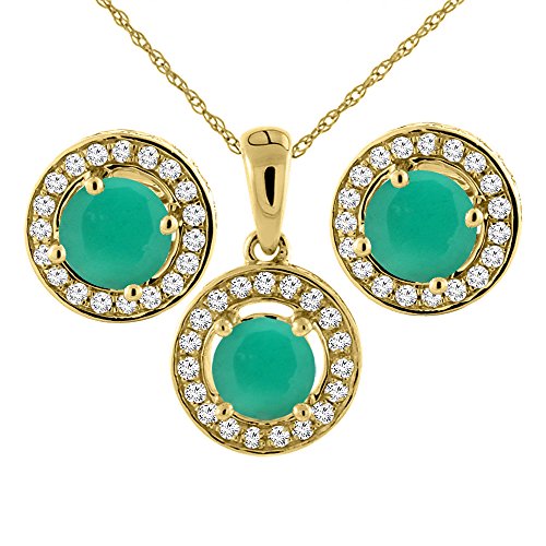 -. Title : 14K Yellow Gold Natural Emerald Earrings and Pendant Set with Diamond Halo Round 5 mm