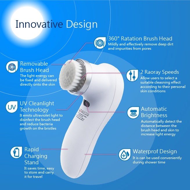 It is the World’s FIRST device that combines deep penetrating 660nm Red Light and gentle exfoliating bristles to wage war against the signs for aging. On the surface, the gentle brushing action removes impurities while smoothing away surface imperfections. Below the surface, the penetrating light therapy stimulates collagen to naturally building your skins structure from below and reduce wrinkles. Cleansing brushes can collect bacteria and viruses that breed due to the warm moist bathroom environment. Its patent-pending UV Clean Light Technology emits ultraviolet light to further kill bacteria on the bristles. The best part is that it’s activated each time it is put back on its charging base.