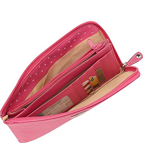 One slip pocket, center zip, 3 slip pockets, 13 credit card slots