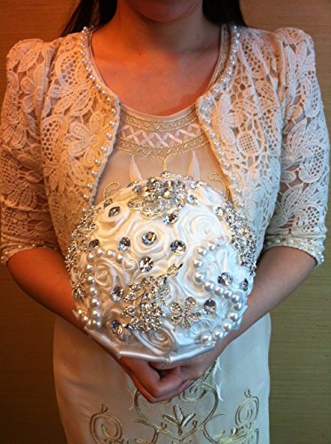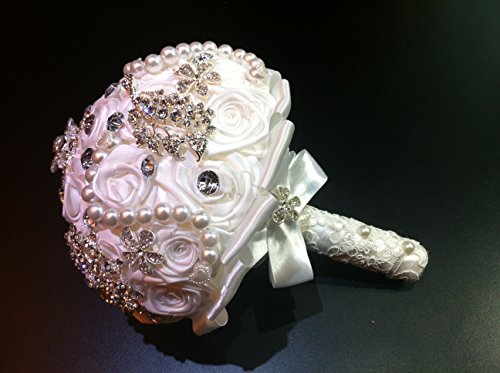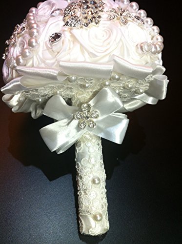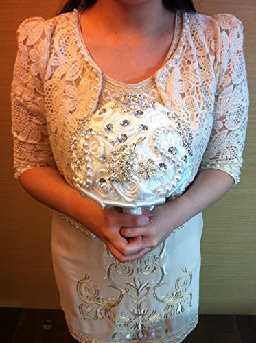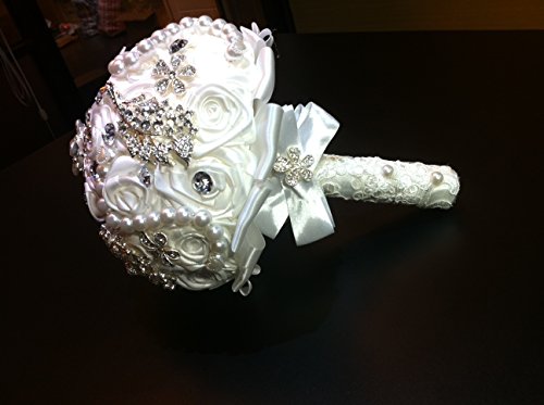 - Feature : Diameter: 7.9 inches, Weight: 0.7 lbs / Materials: satin ribbons, lace, decorative brooches/ pearls, foam top inner base, PVC holder / Designed by M.Ching (Society6.com Artist) / This SNOW QUEEN bouquet has a base of about 3 dozen pure white satin roses. The top is garnished with 5 huge brooches and about 30-35 smaller brooches with pearl and crystal sprays throughout the bouquet. The base holder is covered in a floral pattern lace with 20-30 pearl sprays. / PLEASE NOTE: The bouquet you will get is generally the same as on the pictures. Sometimes the designer, M.Ching, would use a similar brooch if a particular brooch is out of stock. She guarantees the general feel of the bouquet would be definitely the same as described. Rest assured most of the brooches are the same but, sometimes, if a particular brooch is out of stock, she will replace it with a similar one. We want to see a happy bride and a happy customer so we make a note here. We wish you a happy wedding day!