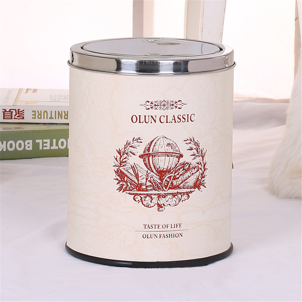 European Style Retro PU Leather Waste Bin Stainless Steel Rubbish Bin Swing Lid Garbage Can Home Office