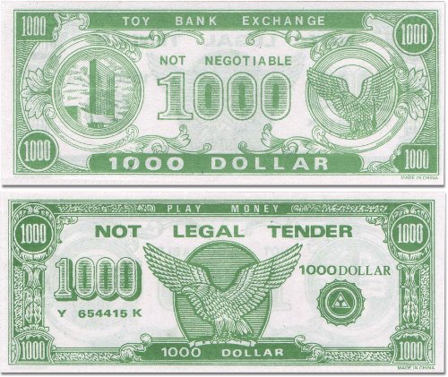 Studio : CSC Publisher : CSC Binding : Toy Product Description Complete your party with this package of high quality 1000 double sided Play Paper Money Bills. Enjoy your casino party with this fake money. Nothing beats our life-size, realistic-looking bills which measure 6 x 2 1/2 inches just like real money. Our bills are printed on 20 pound paper in a realistic green ink on both sides. Great for party favors, teachers, as a learning aide, casino parties, card games and more! 0