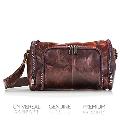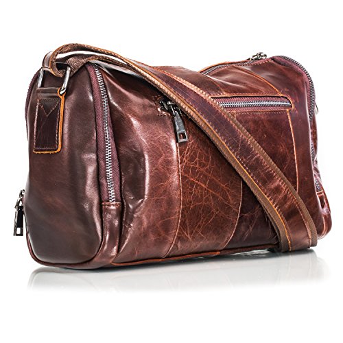 -. Feature : Handsome Genuine Leather - Crafted with premium cowhide leather, this stylish men's handbag offers a smooth texture and tear-resistant durability. / Business and Travel Friendly - Ideal for on-the-go business men, these small satchels hold tablets, a change of clothes, or personal items. / Trendy Colors - This fashion-forward handbag comes in three designer colors, including dark brown, dark green, and purplish red. / Multiple Carrying Points - Each bag features a matching leather shoulder strap and thick, durable handles for more convenient carry support. / Premium Durability - Along with a zippered closure and metal buckles for security this men's bag is reinforced with thick stitching for long-lasting strength.