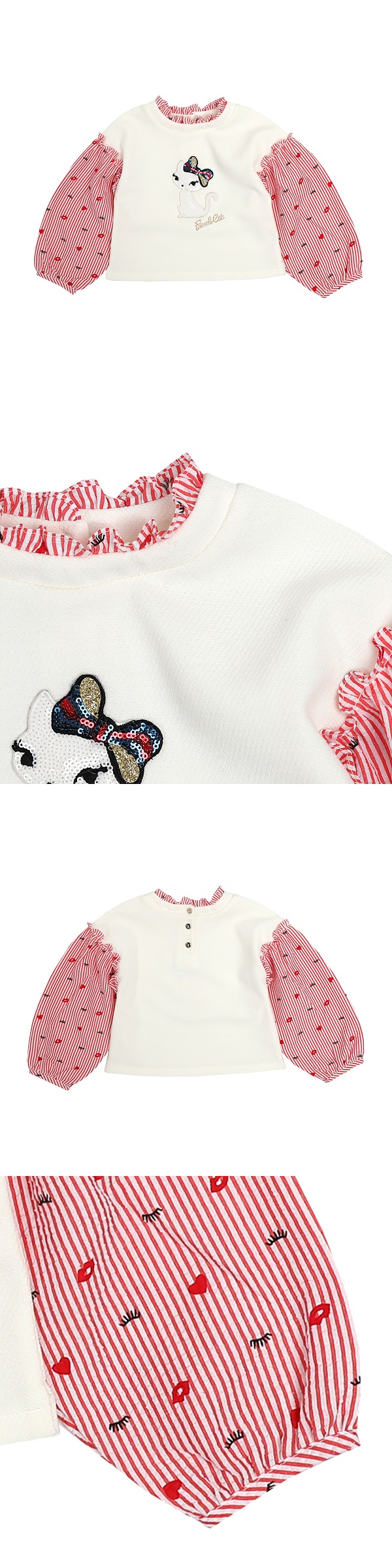 소매가 레드 스트라이프가 배색이 되어있는 탑입니다.
