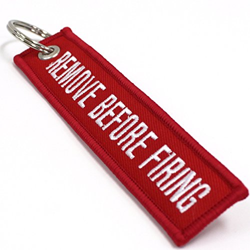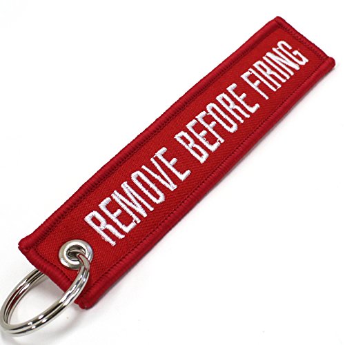 -. Feature : REMOVE BEFORE FIRING is embroidered on both sides / Size: 12.5cm x 2.5cm / Keyring Size: 25mm / Total Keychain Length: 15cm