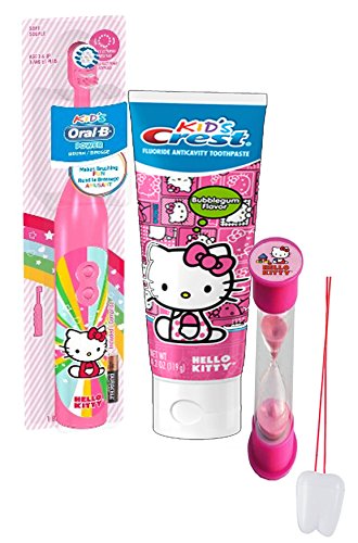 -. Feature : (1) Hello Kitty Turbo Powered Spin Toothbrush (Batteries Included) / (1) Hello Kitty 2 Minute Dentist Recommened Brushing Timer To Encourage Proper Brushing! (Assorted Styles) / (1) Crest Kids Hello Kitty Bubble Gum Flavored Toothpaste / Plus Bonus "Rememer to Brush Your Teeth" bathroom visual aid! This bright foam ornament is a helpful reminder for kids of all ages! Hang it in their bathroom or by their bed so they remember to keep their teeth sparkly fresh.