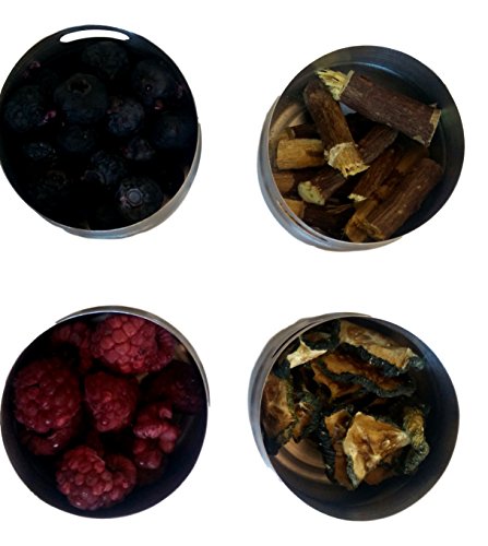 -. Feature : Gin Botanicals Spice Kit in stainless steel magnetic tins / Get 4 of your favorite gin botanicals in this practical and stylish holder / This gin botanical kit comes with freeze-dried raspberries, freeze-dried blueberries, freeze-dried cucumber and licorice sticks / Each gin spice comes in a convenient see-through tin with magnetic backing / The magnetic tins stays securely in place on any metal surface making them easy to get to, put away and keep organized