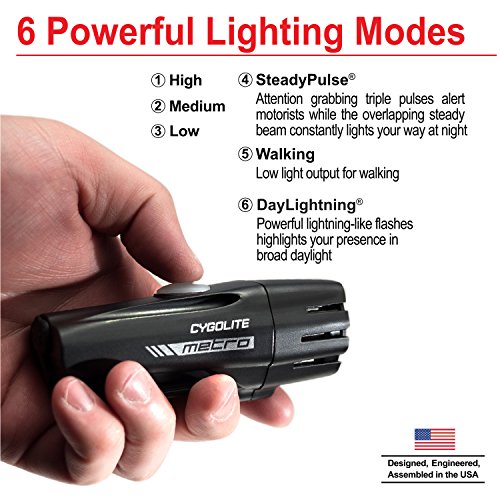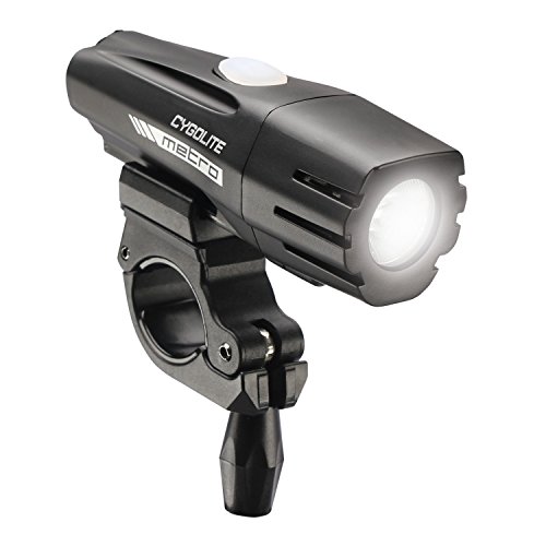 Studio : Cygolite Publisher : Cygolite Binding : Sports Product Description The Metro was created with the commuter in mind and offers a powerful and affordable solution to light the way from point A to point B. Power: 5 wattsOutput: 500 lumensSix Lighting Modes: Medium, High, Low, SteadyPulse, DayLightning, and WalkSteadyPulse illumination combines steady brightness to see by and an alerting flash to be seenDayLightning provides boosted output in lightning-like flashes to enhance rider visibility in daylightItem Includes: headlight unit with integrated battery, USB charge cable and handlebar mountUSB rechargeable internal Li-ion battery Item SpecificationsBattery SizeN/AWeight110gBulbLEDRun Time10 HoursBatteryLi-Ion,USB Rechargeable 0