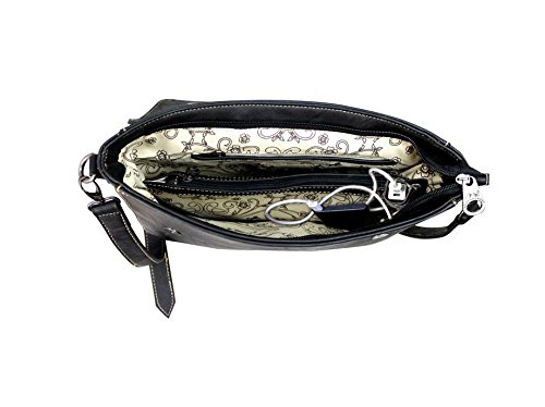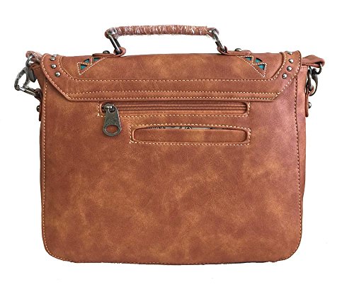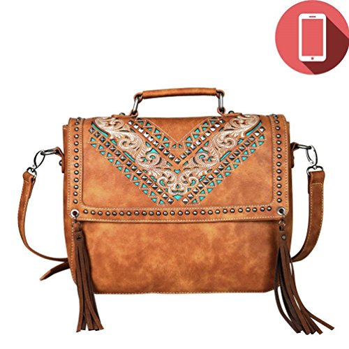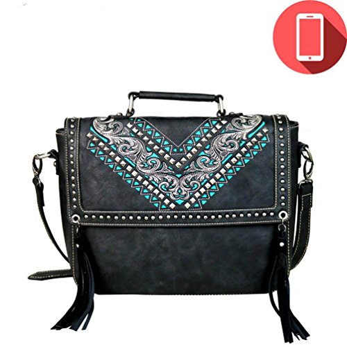 Montana West brand western style ladies satchel / crossover body purse made with high quality PU leather. Contains a removable, rechargeable and completely portable USP charging power bank. Charger is compatible with iPhone 5, 6, 6P, 7, 7P, Android, Galaxy and Smartphone products. Comes with a top satchel handle and a detachable/adjustable strap for wearing on the shoulder or across the body. Decorated with an embroidered floral design and cutout tribal pattern on the front and removable fringe tassels on the flap. Very versatile, great for casual or work. Size: 12" tall x 12 ½" wide x 4" deep 0 |
