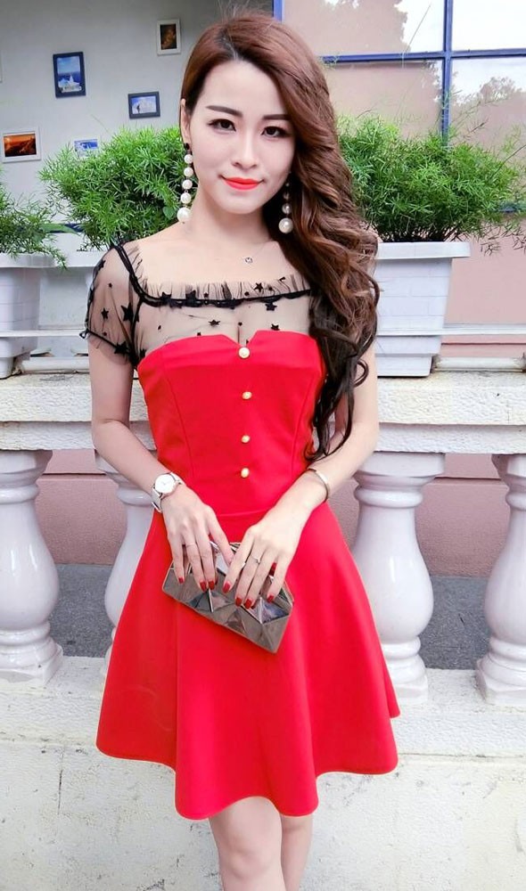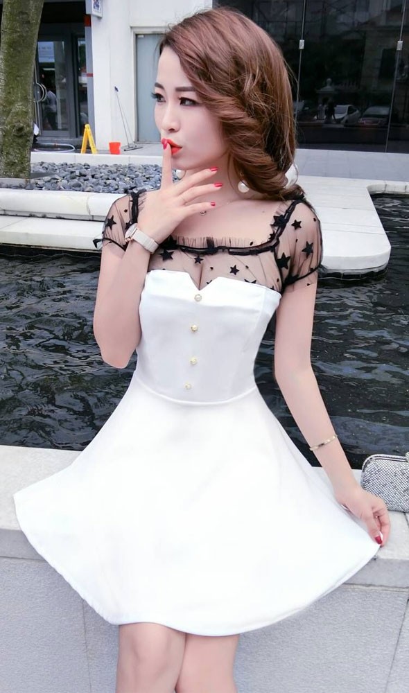 商品名□星柄シースルーチュール切替スクエアネックフレアミニワンピース全3色FYQ80898#e49e51【予約販売12月下旬より順次発送予定】 【送料無料】フレアミニワンピース パーティードレス 星柄シースルーチュール切替 スクエアネック