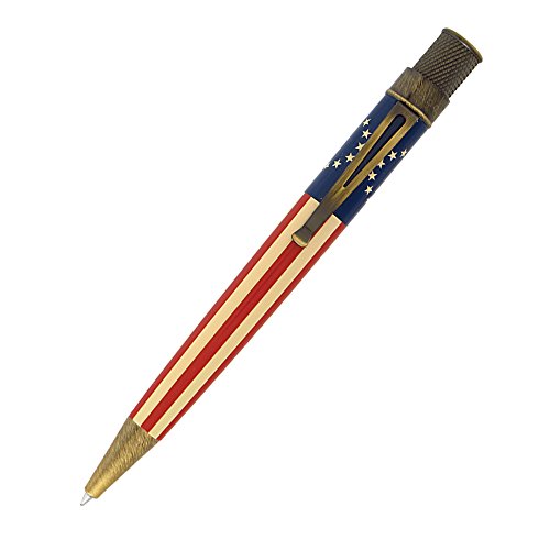 Retro 1951's Tornado Vintage Metalsmith Betsy rollerball pen has a body with the original American Flag. Detailed with an antiqued bronze finish, this pen makes that unique statement you want. Comes in a packaging tube with label for great gifting.