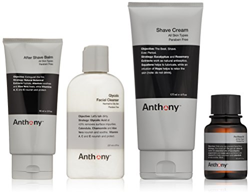 The Perfect Shave Kit by Anthony contains all products needed cleanse, protect, smooth and soothe skin for the best shave ever. Includes Glycolic Facial Cleanser (8 oz.), Pre Shave Oil (2 oz.), Shave Cream (6 oz.) and After Shave Balm (3 oz.).