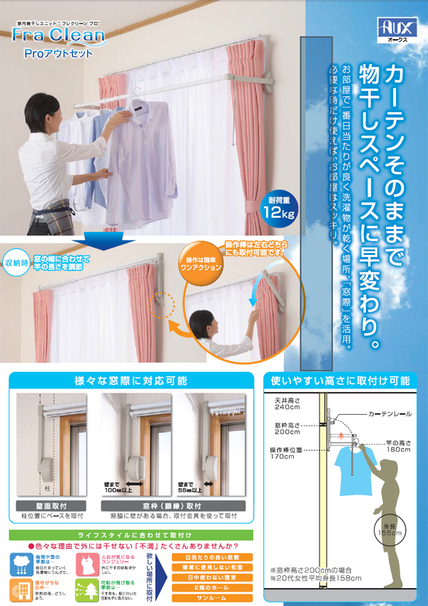 ●操作は簡単ワンアクション、壁面設置の室内物干し!