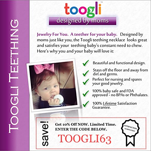 The Toogli teething pendant comes with 7 day/week customer service and Toogli's industry leading no-hassle, better than money back, lifetime guarantee - if you ever decide you are not completely satisfied, we'll refund your money immediately, no questions asked and we'll even cover the return shipping.