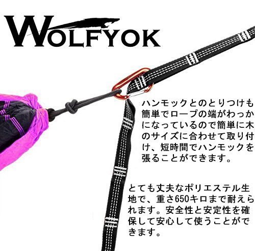 独特なデザイン、おしゃれなハンモック固定ロープ:黒に白のラインが入っているデザインはシンプルでながらおしゃれで、入っている袋がまた特殊な生地も手触り良いのです。ノードがあり、付属するフックで適度な長さに調節ができ、便利で楽になります。