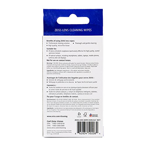 Title : Zeiss Pre-Moistened Lens Cleaning Wipes [2016 New Alcohol Free Formula]- Cleans Bacteria Germs without Streaks for Eyeglasses Sunglasses iPhone Tablets-(30 Count)