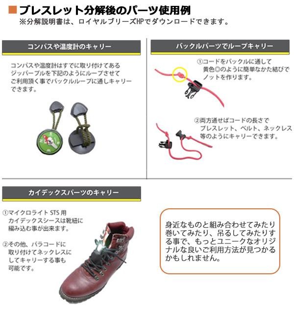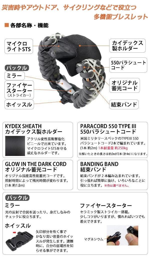 | 素材・材質 | バックル:ナイロン樹脂 バックルファイヤースターター:マグネシウム ストライカー:セラミック ミラー:アクリル カイデックス製ホルダー:アクリル変性高衝撃塩化ビニール 蓄光コード:PP 結束バンド:ナイロン 550パラシュートコード:ナイロン |
