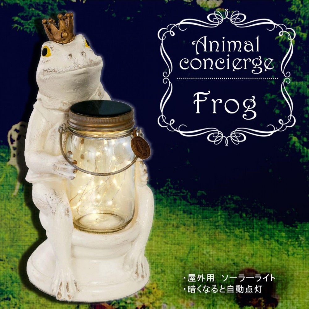 | 暗くなると自動点灯するボトル型ソーラーライトを携えたアンティーク調のアニマルが、暗いお庭を照らしてくれます。夜お家に帰るたびに「こちらですよ」と言われているような楽しい気持ちになれそうです。 |