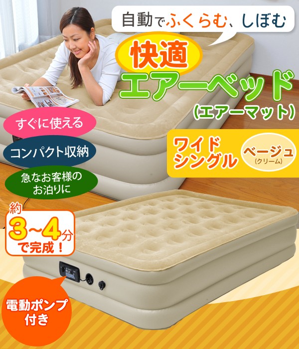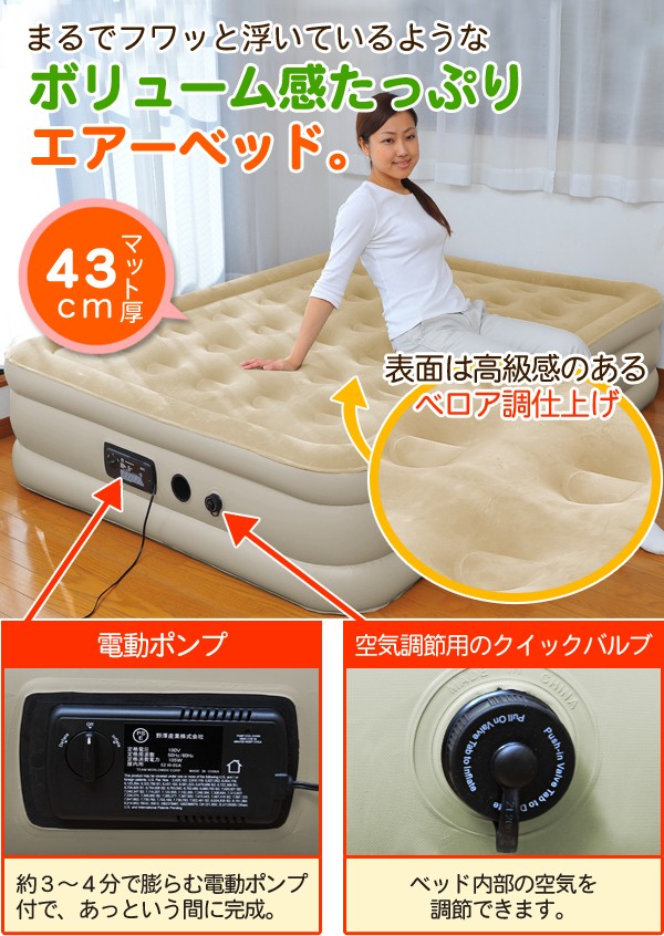 | <h1>自動で空気が入り、約3~4分で完成するエアーベッド。空気抜きも自動でできるので簡単!!空気調節用の大型クイックバルブで空気の調節ができます。マットは、ひんやりしないベロア調の微起毛仕上げ!!ボリュームのあるマットは、むだ揺れしにくくどっしりと安定!!エア3層の立体構造ですぐれた安定感を実現!!急な来客時に便利です!!</h1> |