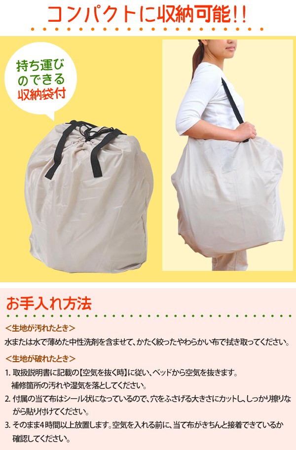 | 自動で空気が入り、約3~4分で完成するエアーベッド。空気抜きも自動でできるので簡単!!空気調節用の大型クイックバルブで空気の調節ができます。マットは、ひんやりしないベロア調の微起毛仕上げ!!ボリュームのあるマットは、むだ揺れしにくくどっしりと安定!!エア3層の立体構造ですぐれた安定感を実現!!急な来客時に便利です!! |
