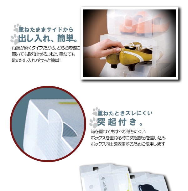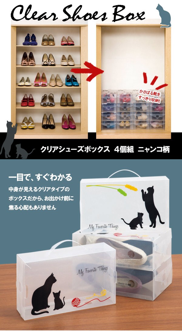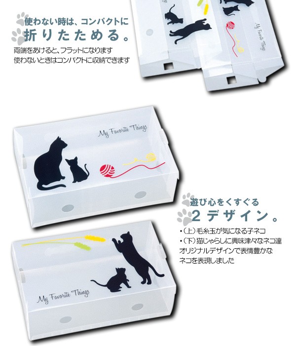 かさばる靴をすっきり収納!取っ手つきのクリアシューズBOX(1)中身が一目でわかる!お出かけ前も慌てない(2)重ねた時、ズレにくい。差し込んで固定する突起付き(3)両端が開くから重ねたままで出し入れ簡単(4)折りたためてコンパクト(5)可愛い猫たちの遊び心くすぐるオリジナル2デザイン。4個組。 |