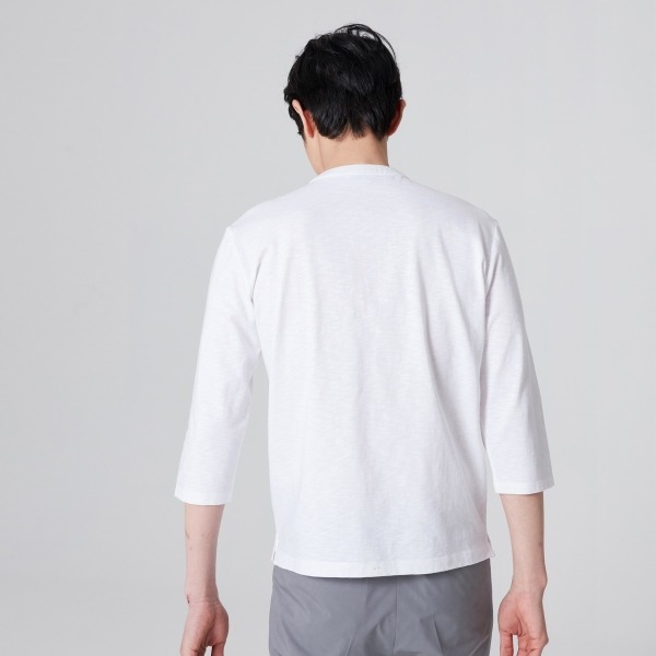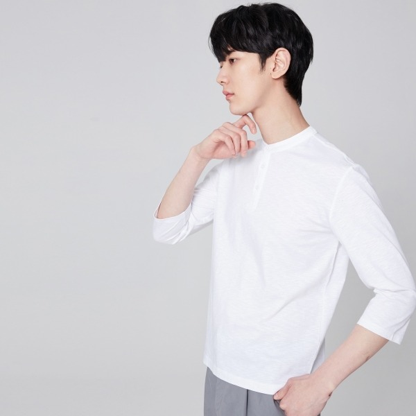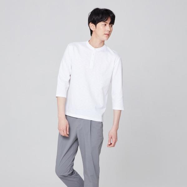 순면 원단을 사용한 헨리넥 티셔츠입니다.헨리넥 라인으로 클래식한 멋을 더해주었으며 시즌성을 고려한 7부 소매 디자인으로 착장이 용이합니다. 베이직한 디자인으로 다양한 코디 연출이 용이합니다.