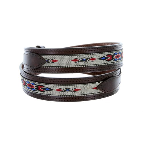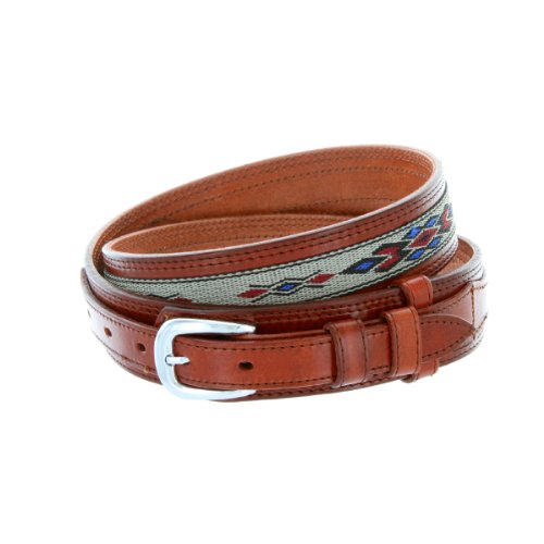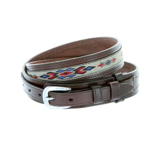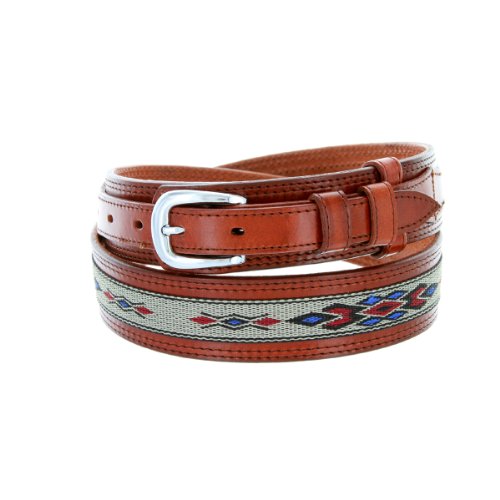 -. Binding : Apparel -. Brand : Belts.com -. Department : mens -. Feature : Western ranger belt design with distinctive extra leather billet strap / Genuine Leather strap with Southwestern pattern canvas accent; Overall belt 1.5 inches wide, 5 holes / Polished nickle plated buckle / Available in sizes 34" - 44"; Measured from the end of the buckle to the largest fitting notch at the tip / Choose one full size up from your waist, measured at the beltloops (round up if necessary) -. ProductGroup : Apparel -. ProductTypeName : ACCESSORY -. Title : Mens Genuine Leather Ranger Belt with Southwestern Woven Diamond Pattern Accent