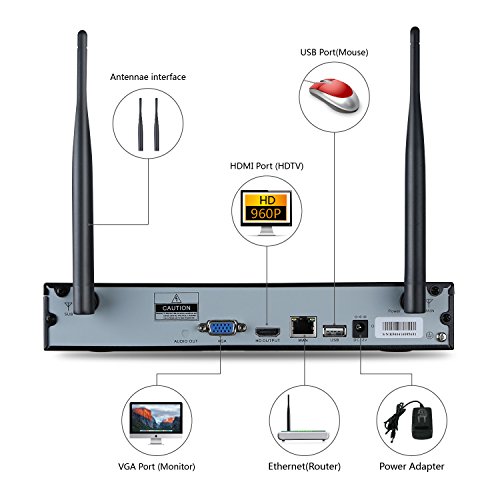 -. Feature : 4ch HD 960P(1280x960) wireless network camera system provides more clear & crystal Image and capture more details in a larger area. NVR built in router and two wifi antennas, so the wireless range can cover 1500ft in open area, up to 250ft with obstacles (Between one wall and three walls). / Remore view anywhere: View the system on mobile App from anywhere and anytime; You can download IP PRO app from Android Google Play or Apple APP Store to spend minutes to set up on phone. Or easily connect to your tablet or PC to view. Besides, you can scan the QR code on the PC to download App. / Motion Detection Recording, Receive email alerts upon motion detection. Synch-playback, video backup, video playback and video detection. / Support 1 sata port & max video storage 4TB & 2 USB 2.0 port for operation of mouse control, back up. Plug & Play: The system will auto run when power on the NVR and 4 cameras in wireless mode. / Kindly notice: This HDD is not included for this AKASO WIFI 960P system and also this ip camera is IP66 Weatherproof. Besides, pls note that this wireless security system does not mean you can use the system without any cables but power supply is needed for supplying power to cameras and NVR and if its necessary when you first connect the camera and NVR, you can connect them with ethernet cable to match wireless code as a result of wireless using.