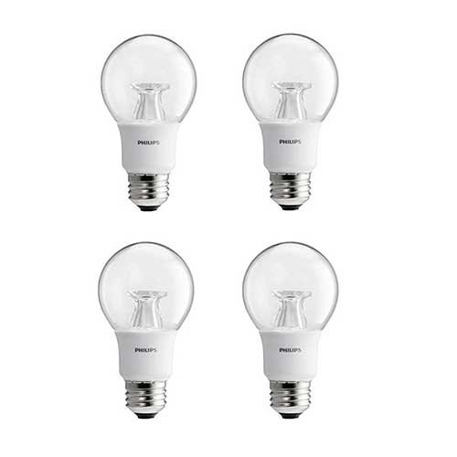 Philips A19 LED light bulbs provide 800 Lumen's of soft, glowing white light, equivalent to 60-watt incandescents with 80% less energy use. These bulbs fit standard medium base (E26) fixtures with the look and feel of a classic bulb. Not for use with Philips HUE products.