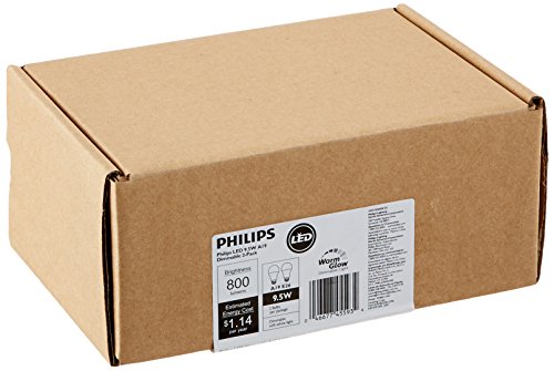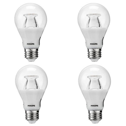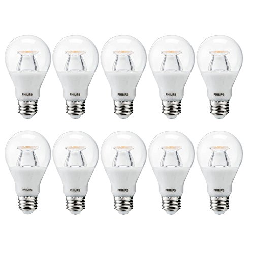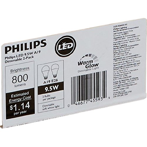 Philips A19 LED light bulbs provide 800 Lumen’s of soft, glowing white light, equivalent to 60-watt incandescents with 80% less energy use. These bulbs fit standard medium base (E26) fixtures with the look and feel of a classic bulb. Not for use with Philips HUE products. Warm Glow dimming offers flicker-free, silent dimming that works with more dimmer switches than any other LED on the market. The more you dim, the warmer the light--from 2700 to 2200 Kelvin just like traditional incandescent light bulbs. Best-in-class the Energy Star Certified Philips LEDs provide flicker-free, natural lighting at 1/4 of the energy of incandescents, 1/2 the energy of halogens and with 10X and 4X the lifespan respectively. Philips LEDs are mercury-free so they don't contribute to harmful hazardous waste. Classic A19 soft white light bulbs are perfect anywhere you need a balance of clarity and warmth with the flexibility of dimming. The E26 medium base fits standard fixtures on pendant, vanity, and bare lamps, providing soft white light with warm dimming. This pack of 2, A19 Philips LEDs comes with a 5-year warranty. Each bulb is expected to deliver a lifetime of up to 15,000 hours and over 10 years (based on three hours per day), saving you the cost and hassle of frequent bulb replacement.Feature