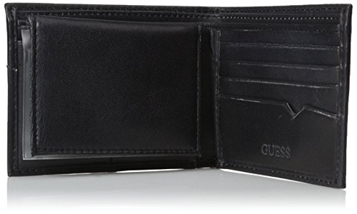 Guess Belmont pass case men's wallet has a metal logo plaque on the front. Includes a gift box. Wallet dimensions are 3.5x4.5 . Interior features 4 credit card slots, 2 hidden pockets, 1 removable id holder, and 1 bill pocket with divider.Feature