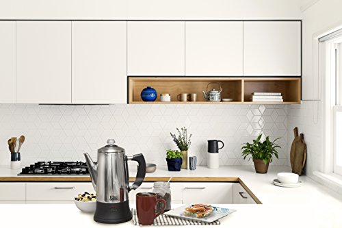 Brewing hot beverages the old fashioned way has never been easier with the Elite Platinum 12 Cup Automatic Tea & Coffee Percolator. This lightweight, portable unit brews up to 12 delicious cups of your favorite coffee or tea. It features an easy to wash removable stainless steel filter, power and ready indicator lights which let you know when your beverage is ready to be served, an automatic keep warm feature, and a comfort grip heat resistant handle making serving safe and easy. With a convenient 360° swivel base providing cord-free serving and stylish stainless steel finish. Boil dry safety feature. Transparent brew progress knob and classic precision pouring spout. Cord storage and non-slip feet for safety. This percolator makes the perfect addition to any home or office.Feature