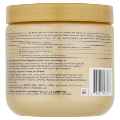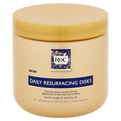 -. Binding : Misc. -. Brand : RoC -. Feature : Dual-textured cleansing pad with skin-nourishing cleansers / Clinically shown to diminish the appearance of fine lines and wrinkles, and improve the appearance of skin in just 1 week / Gently cleanses and removes make-up around the delicate eye area / After 4 weeks signs of photo-aging appear diminished / After 12 weeks the appearance of wrinkles and pores is diminished -. Label : RoC -. Manufacturer : RoC -. MPN : 108318 -. PackageQuantity : 1 -. PartNumber : 108318 -. ProductGroup : Beauty -. ProductTypeName : BEAUTY -. Publisher : RoC -. Studio : RoC -. Title : ROC Daily Resurfacing Disks, 3-inches