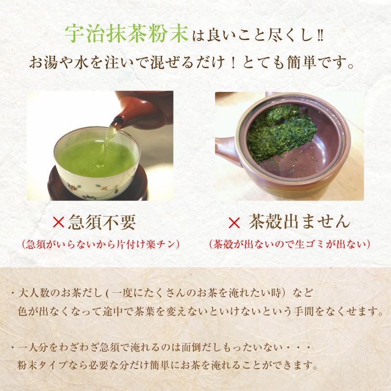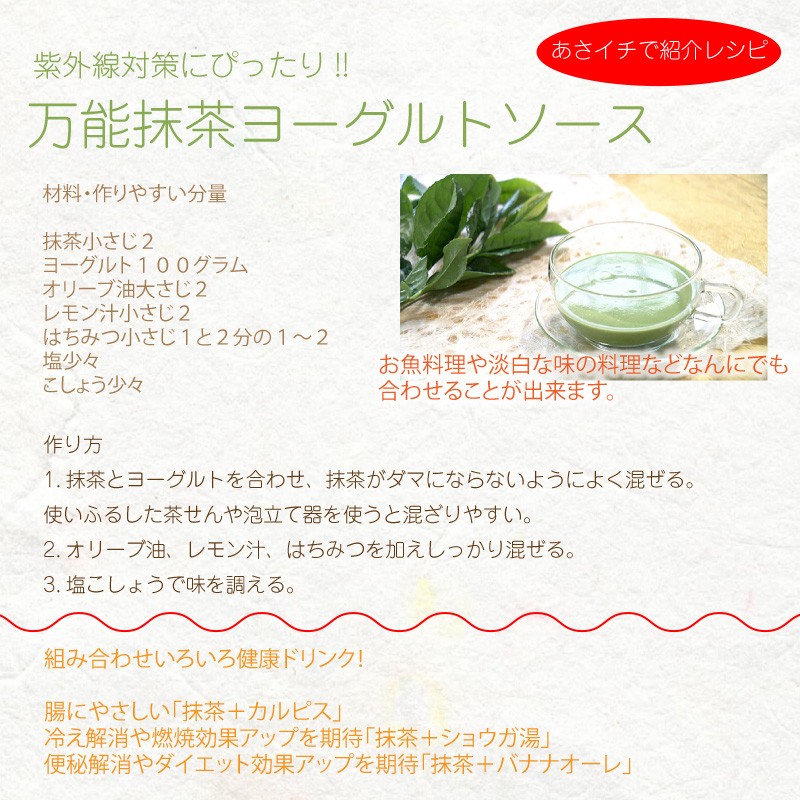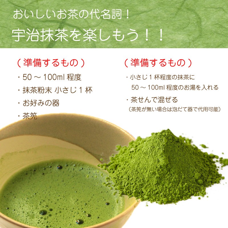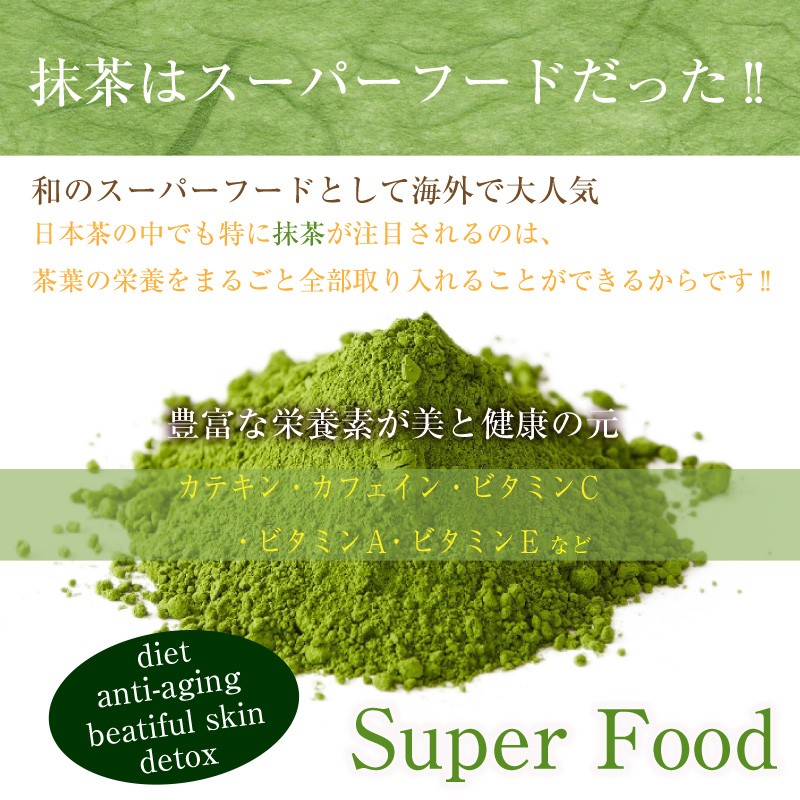 | 商品説明 | It is a powder of green tea(Matcha) 乾燥により抹茶に小さなツブができる事がありますが、 これは静電気の作用によるもので、品質的には何ら問題はありません。 | |