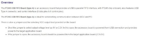 The FT245 USB FIFO Board (type A) is an accessory board that provides a USB to parallel FIFO interface, with FT245 chip onboard, also features USB Type A connector, and control interface (8 data pins & 6 control pins).