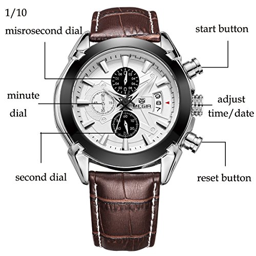-. Feature : A nice mix of sports and dressy , Elegant Stylish Design , Bold Look and Heavy Watch , Great for casual use , parties , sports , Best gift for men very cool. / Soft Durable Genuine Leather Strap , Provide you comfortable experience , Gorgeous face , Cool hour hand , Easy to read. / Professional Japanese quartz movement with analog display , Protective mineral crystal protects watch from scratches. / Case diameter : 43MM (1.69") , Case Thickness: 10MM (0.39") , Band Width: 20MM(0.79") , Band Length: 220MM(8.67") , Function: Calendar , Chronograph(The above is 1/10 chronograph dial, the following is chronograph dial, the left is the minute chronograph dial). Daily Water resistant to 99 feet (30 M): withstands rain and splashes of water, but not showering or submersion. / Please notice : the watch packages in simple opp bags and you could see the last picture to set the time or connect with us on amazon