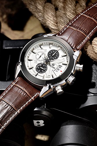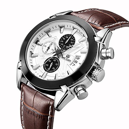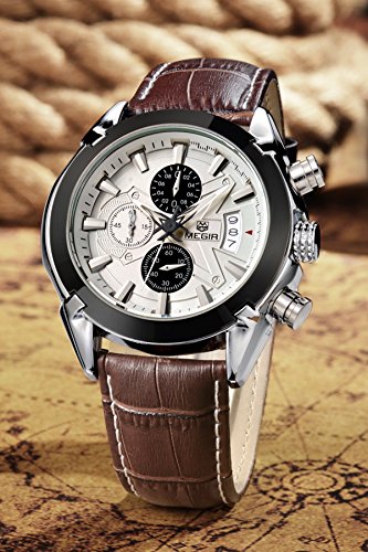 -. Title : Megir Men Brown Military Pilot Multifunction Leather Quartz Wrist Watches