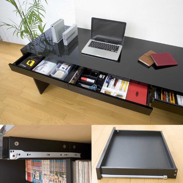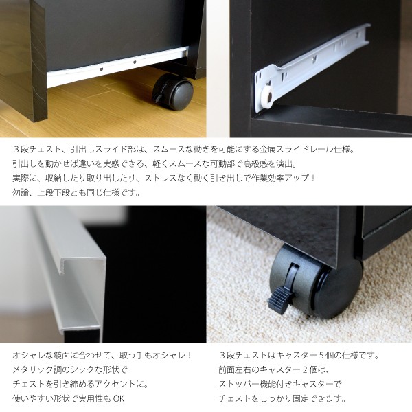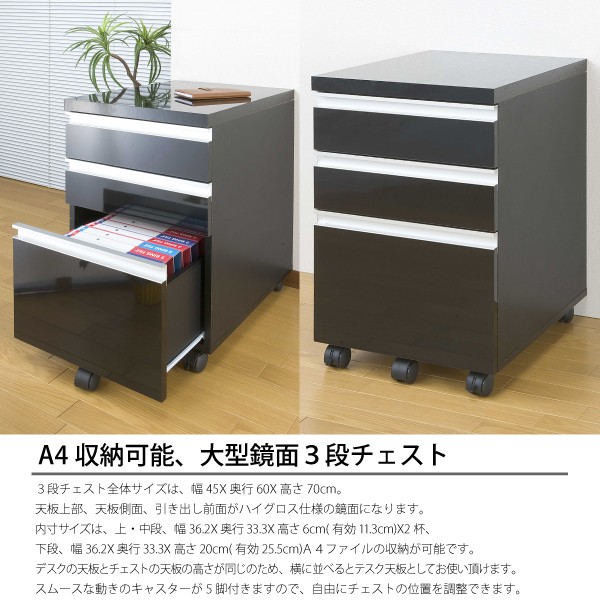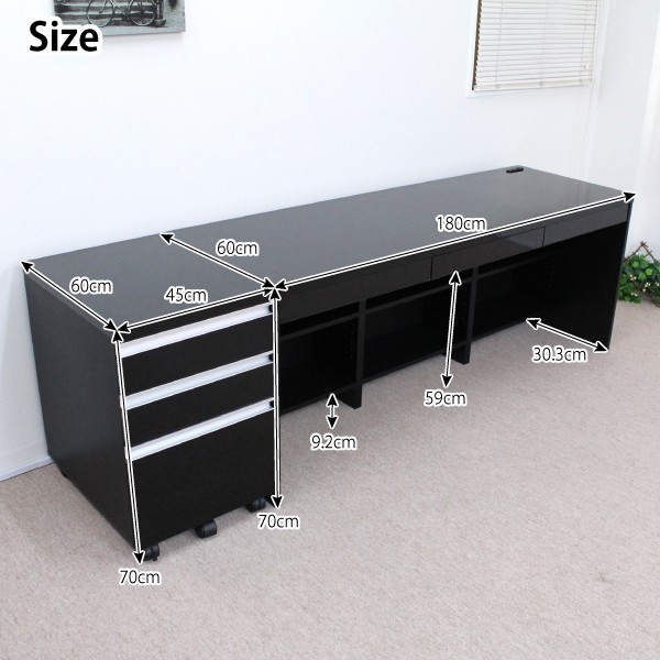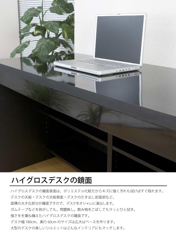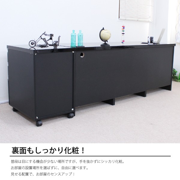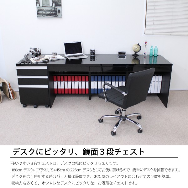 送料無料 オフィスデスク パソコンデスク 書斎机 鏡面 引き出し 2点 セット 3段 チェスト 180cm 木製 ブラック 北欧 おしゃれ モダン