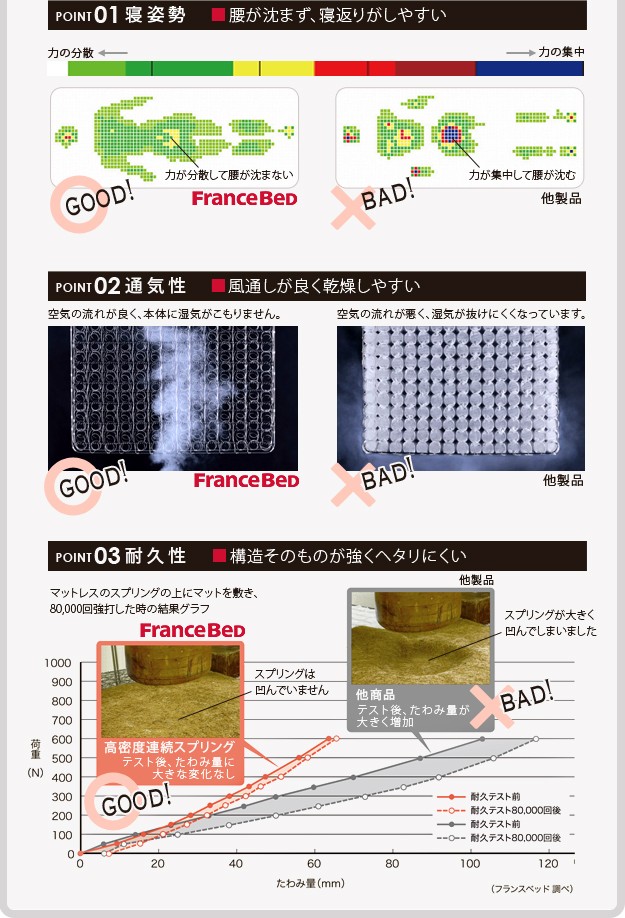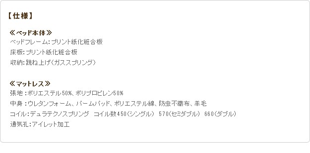 ●材質:[ベッド]本体-プリント紙化粧合板、[マットレス]側地-ポリエステル50%・ポリプロピレン50%、中身-ウレタンフォーム・パームパッド・ポリエステル綿・防虫不織布・羊毛、コイル-デュラテクノスプリング・コイル数660、通気孔-アイレット加工