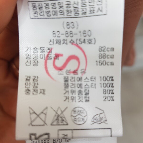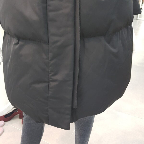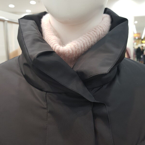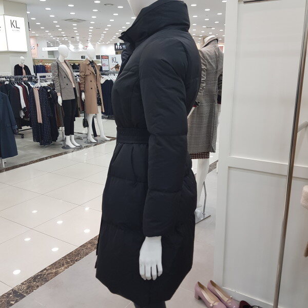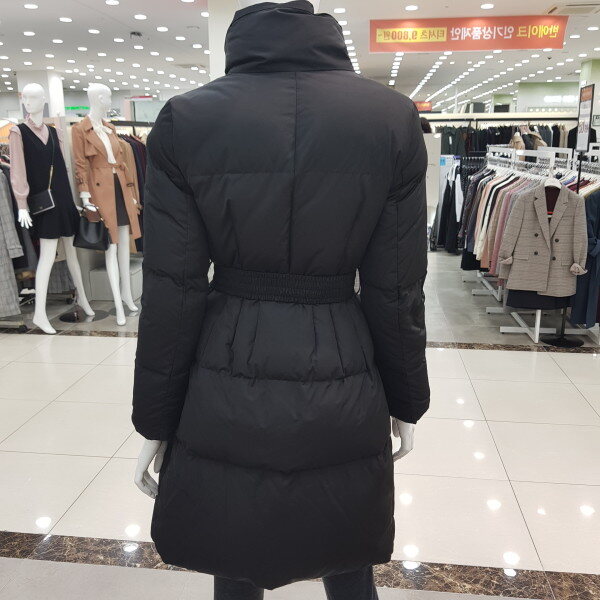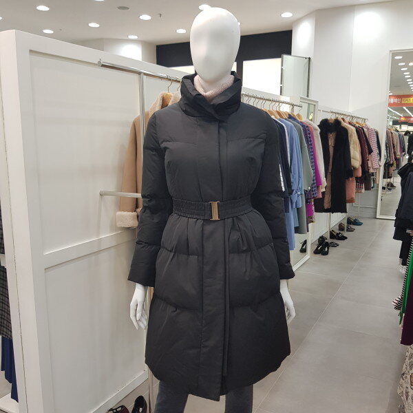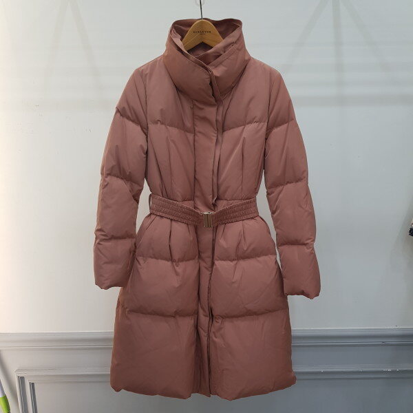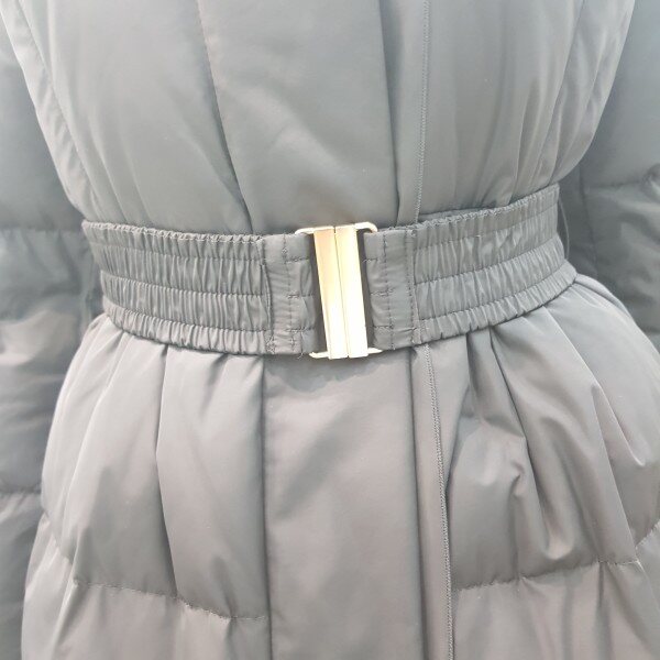 허리쪽에 턱장식이 있는 핏앤플레어 실루엣의 구스 다운으로 허리벨트로 여성스러움을 강조한 스타일