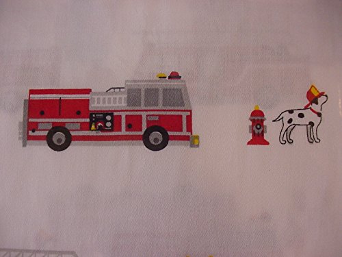 -. Feature : Fabric: 100% cotton / Pattern: Fire trucks and fire dogs on white background / Size: Twin / Includes: twin flat sheet, twin fitted sheet, one standard pillowcase