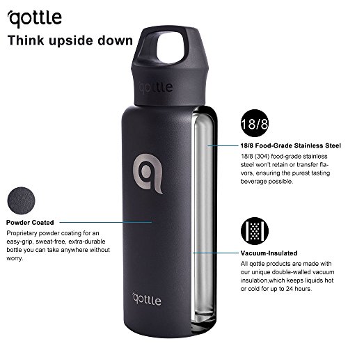 qottle-Think upside down. At qottle, we're turning the premium water bottle world upside down by offering high-quality, 100% stainless steel bottles and tumblers at affordable prices. Our community is a diverse one, because healthy hydration is for the many, not the few. So whether you're a master of the outdoors, a casual creative, or an office superstar, there is a durable and uniquely stylish qottle for you. qottles are eco-friendly, hypoallergenic, customizable, and double-insulated-allowing you to keep cool or stay steamy as long as you need. Introduction: Qottle is a vacuum-insulated stainless-steel mug that is easy to snap open and closed, leak-proof when sealed shut and is great for using in your home, office and even outdoors. This vacuum insulated water bottle is designed as the perfect companion for daily life or travel and is fantastic for both hot and cold drinks. Vacuum insulation keeps beverages hot for up to 24 hours and cold for up to 24 hours. This travel flask is rugged and durable with a stainless-steel interior and exterior. Features: 1.89" Standard Mouth Opening Non-slip powder coated Double Wall Vacuum Insulated Keeps Hot up to 24 Hours, Keeps Cold up to 24 Hours BPA-Free, 18/8 Stainless Steel The handle on the lid makes it super easy to carry and store Lifetime Warranty Big Discount for accessories Best gift For all the festival or anniversary
