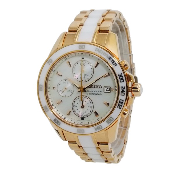セイコー SEIKO 海外モデル レディース クロノグラフ 時計 ウォッチ   商品仕様:(約)H38×W38×D10mm(ラグ、リューズを除く)、重さ(約)100g、腕回り最大(約)17.5cm、腕回り最小(約)11cm ステンレス(ケース)、ステンレス×セラミック(ベルト) 取扱い説明書、保証書、ボックス