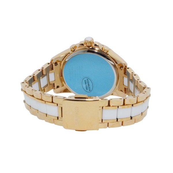 仕様 クオーツ、10気圧防水、クロノグラフ、カレンダー(日付)、カラー:ホワイトシェル(文字盤)、ホワイト×ピンクゴールド(ベルト)