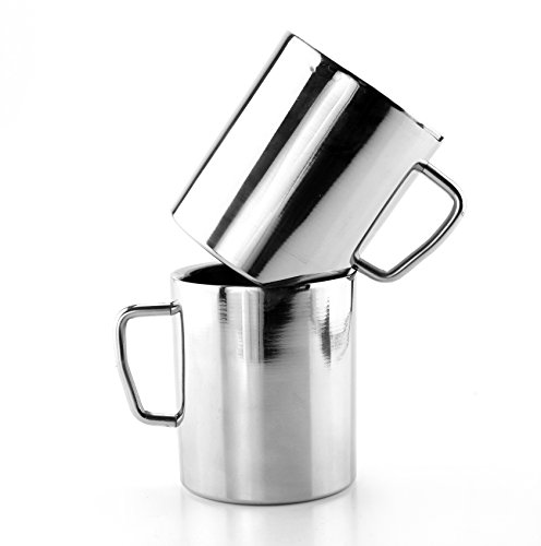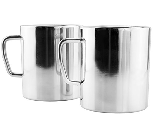 Value-Pack of Two 10-Ounce Capacity Double Walled Stainless Steel MugsWhy stainless steel? No worries about breakageNo worries about chemicals like with plastic, bpa-free Long-lasting durabilityLightweight (less than half the weight of a ceramic mug)Low maintenance, easy careWhy double-walled? Keeps hot beverages hot & cold beverages coldPrevents condensation Protects your hands from extreme heat or cold Uses . . .Great cups for picnics, cookouts, camping, cabins, mess kits, & RVsKid-friendly sizeOn the goOfficeUtility and outdoorsBackpacking, hiking & climbing Dorm & schoolSurvival gear Features:Capacity: 10-ounce maximum [to rim], recommended fill 8 ounces / 1 cupSize: 3.5 inches tall, 3 inches diameter, handle extends 1.25 inches outWeight 6.1 ouncesBrushed stainless steel Mirror-polishedMade in IndiaFeature