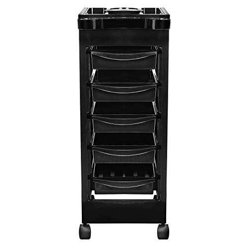 This multipurpose trolley is perfect for beauty salons, tattoo shops, pet groomers, nail technicians and other professionals looking for a utility cart with tons of storage and an attractive, accessible design. Four non-marring swivel casters allow the trolley to be positioned close to your working area, and a push-handle is located on one end of the cart. The trolley body and drawers are molded from high-quality black plastic that is strong, good looking, and durable; it will last a long time. The surfaces are chemical resistant and extremely easy to clean. This cart includes five slide-out drawers, each measuring 13" long, 9" wide, and 2-3/4" deep. Each drawer is fully removable, and their tracks are beveled at the ends to prevent them from opening accidentally during trolley movement. The drawers are interchangeable and can be moved between any of the five drawer tracks. On the top of the trolley are two grooves (one on each side), each designed to receive and hold one of the pullout drawer trays. This allows you to remove one or two of the drawers and suspend them on each side of the trolley (in a "wing" or "T" formation). The top tier features several recessed compartments. There are two 4-1/4" diameter compartments and two side compartments both 13" long and 2-3/4" wide (4-3/8" wide at the center); all are 1-3/4" deep. There are five round openings at the end of the cart to hold accessories or tools: two openings 2-3/8" in diameter, and three 1-3/16" in diameter. Overall Dimensions: 19-1/2" long, 12-1/2" wide, and 32-1/2" tall. The width of this unit expands to 32-1/4" when two drawers are suspended from the top sides. Simple and quick assembly with no tools required; all parts are interlocking and snap together. Instructions are included.Feature