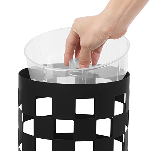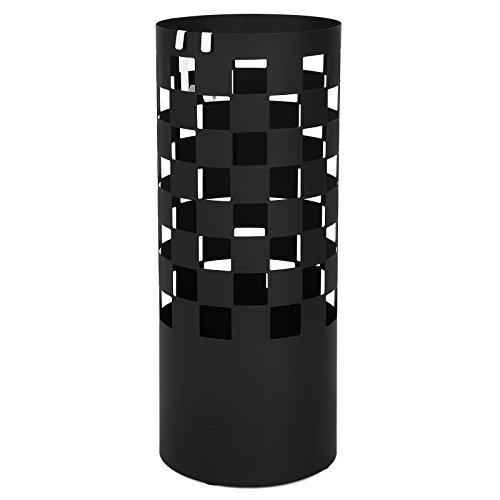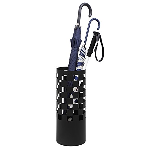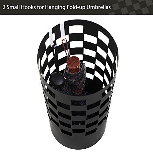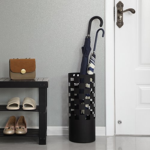 Still looking for a container to organize your cluttered umbrellas? SONGMICS umbrella stand is perfect for you! Artistic cube pattern makes it aesthetically pleasing and easily matches your interior decor. Unique hollow design ensures ventilation so that inside umbrellas could dry quickly. Metal frame keeps it stable and it won't tip over easily. 49 cm height storage unit could hold regular and golf umbrellas and 2 small hooks are for folding umbrellas. The bottom drip tray keeps your floor from water drops and anti-slippery pads protect your floor from scratches. With the size of 7 5/8" Dia. x 19 1/4"H, it is easy to be tucked away in corners or at the entryway. Stylish and practical, this SONGMICS umbrella stand is a rainy day must for your home and office! Specifications: - Color: Black - Material: Iron - Product Size: 7 5/8" Dia. x 19 1/4"H (19.5 Dia. x 49 cm) - Net Weight: 4.32 lbs (1.96 kg) Package Contents: - 1 x Indoor Umbrella Stand - 1 x Drip Tray - 2 x Hooks